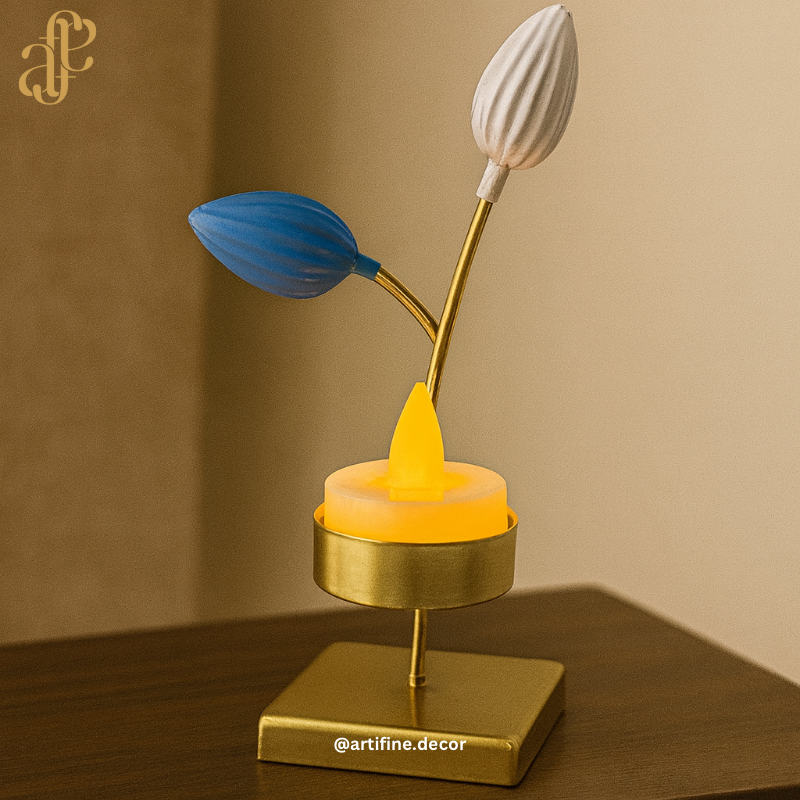 Featuring two sculpted lotus buds in soft blue and white tones on golden stems, this piece adds a calming touch to your décor while holding your favorite candle.