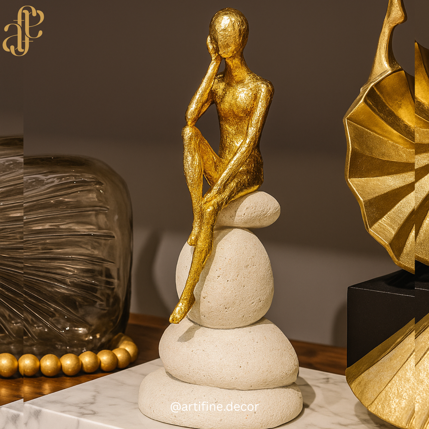 These Elegant Sitting Figurines feature beautifully sculpted black or gold figures seated gracefully on stacked stone-like pebbles, creating a calming and refined decorative piece.