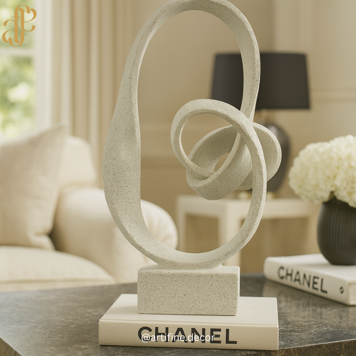 Bring modern elegance into your home with this Interlocking Abstract Loop Sculpture, crafted in a luxurious white stone-textured finish.