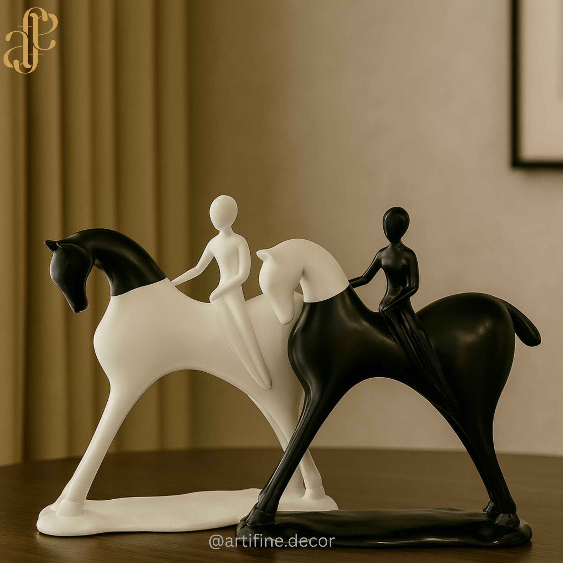 A striking representation of grace and balance — the Equestrian Harmony Sculpture captures the timeless bond between rider and horse in Artifine’s modern monochrome style.