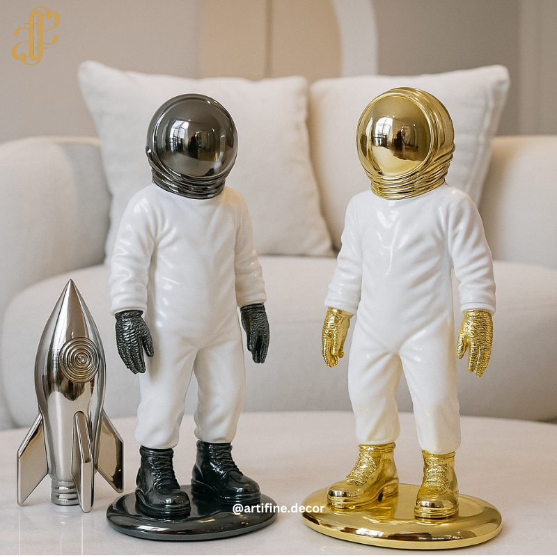 Bring a unique touch of imagination and modern art into your home with our Luxury Astronaut & Rocket Sculpture Set.