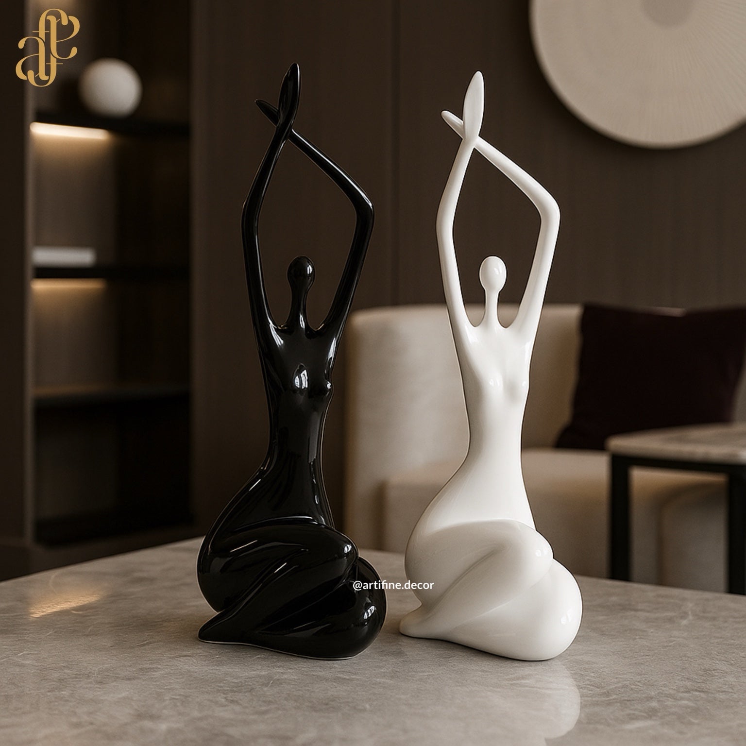 Celebrate the art of contrast and fluidity with our Graceful Harmony Sculptures. Featuring two abstract figures in seated poses with arms lifted in elegance, this black-and-white duo brings a refined balance of modern minimalism and expressive design to any space.