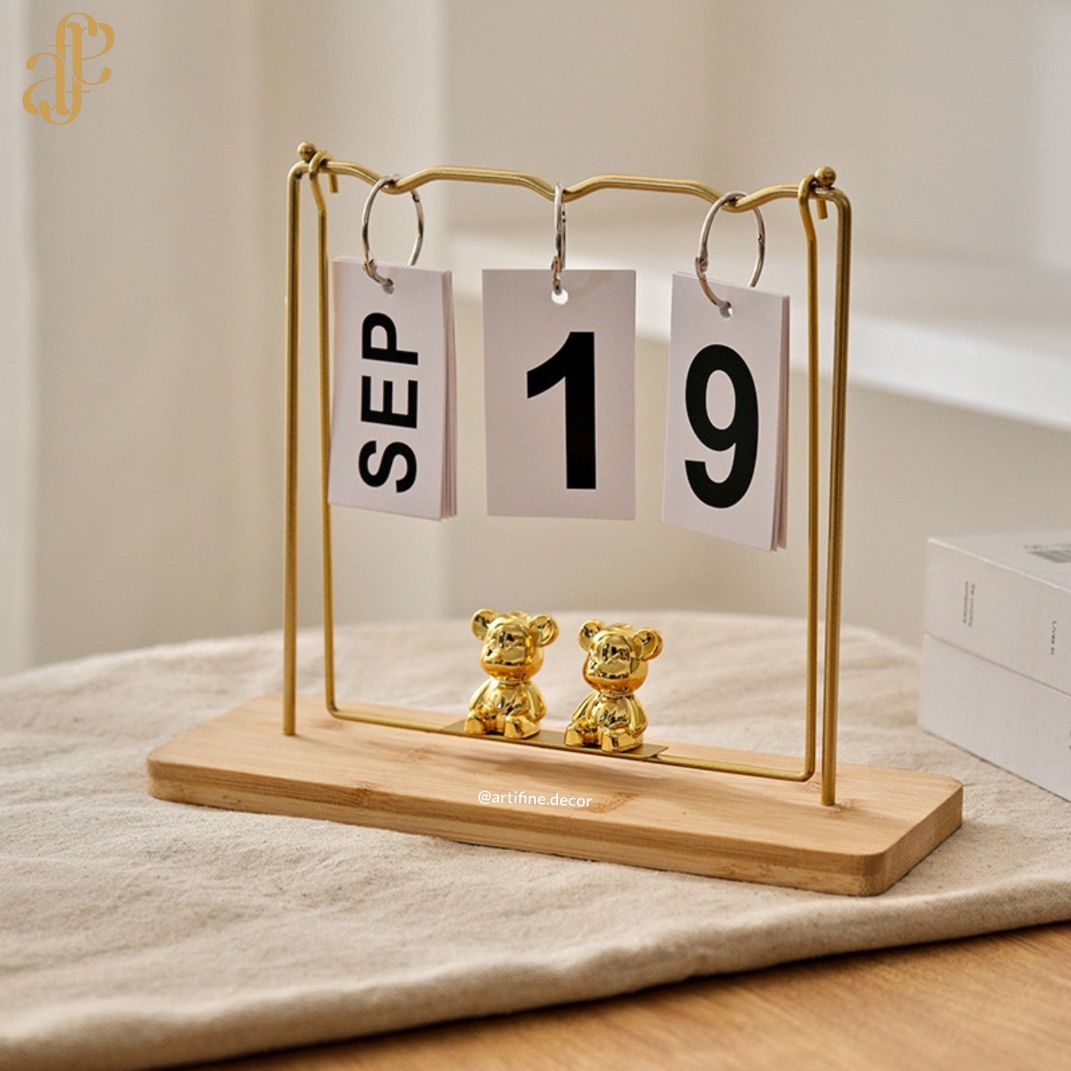 Featuring rotating date cards with adorable metallic bear figurines, this piece keeps your days stylishly organized while elevating your décor.